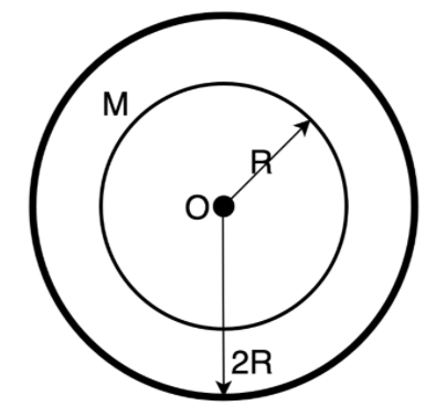 $\therefore M = \rho \times \dfrac{4}{3}\pi [{(2R)^3} - {R^3}]$