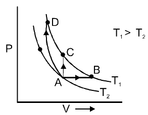 Three different processes that can occur in an ideal monatomic gas are shown in the P vs V diagram. The paths are labelled as A → B, A → C and A → D. The change in internal energies during these processes are taken as ${E_{AB}}$ , ${E_{AC}}$ and ${E_{AD}}$ and the work done as ${W_{AB}}$ , ${W_{AC}}$ and ${W_{AD}}. The correct relation between these parameters are: