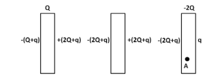 ${E_A} = \dfrac{{ - \left( {Q + q} \right)}}{{A{\varepsilon _0}}} + \dfrac{{\left( {2Q + q} \right)}}{{A{\varepsilon _0}}} - \dfrac{{\left( {2Q + q} \right)}}{{A{\varepsilon _0}}} + \dfrac{{\left( {2Q + q} \right)}}{{A{\varepsilon _0}}} - \dfrac{{\left( {2Q + q} \right)}}{{A{\varepsilon _0}}} - \dfrac{q}{{A{\varepsilon _0}}}$