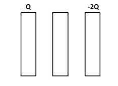 Three identical metal plates with large surface areas are kept parallel to each other as shown in figure. The leftmost plate is given a charge $Q$, the rightmost a charge $ - 2Q$ and the middle one remains neutral. The charge appearing on the outer surface of the rightmost plate is?