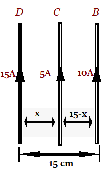 Force on wire C due to wire B$ = \dfrac{{{\mu _0}}}{{4\pi }}\dfrac{{2 \times 10 \times 5}}{{15 - x}}$