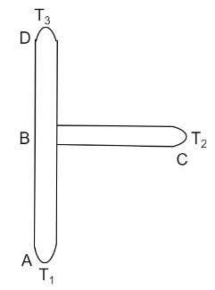 Three rods AB, BC and BD having thermal conductivities in the ratio $1:2:3$ and lengths in the ratio $2:1:1$ are joined as shown in Fig. The ends A, C and D are at temperature ${T_1}$, ${T_2}$ and ${T_3}$ respectively. Find the temperature of junction B. Assume steady state.