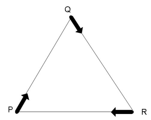 Three-person P, Q, and R of the same mass travel with the same speed $u$ along with an equilateral triangle of side \['d'\] such that each one faces the other always. After how much time will they meet each other?