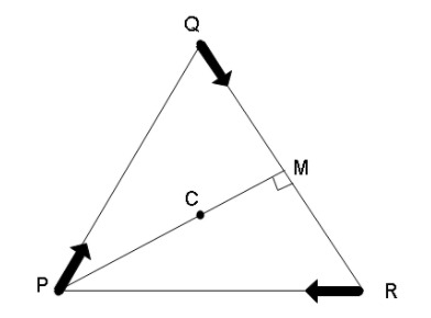 This implies that all three people slowly moving inward will eventually meet at the centroid of the triangle. Now, the distance between, say person P, and the centroid will be $2/3$ times the length of the segment that joins P and the midpoint of the opposite side. SO, we can write