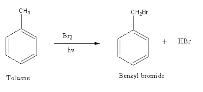 In the above reaction, toluene reacts with bromine in the presence of light to form benzyl bromide. In the presence of light, the side chain bromination reaction takes place due to the formation of free radicals.