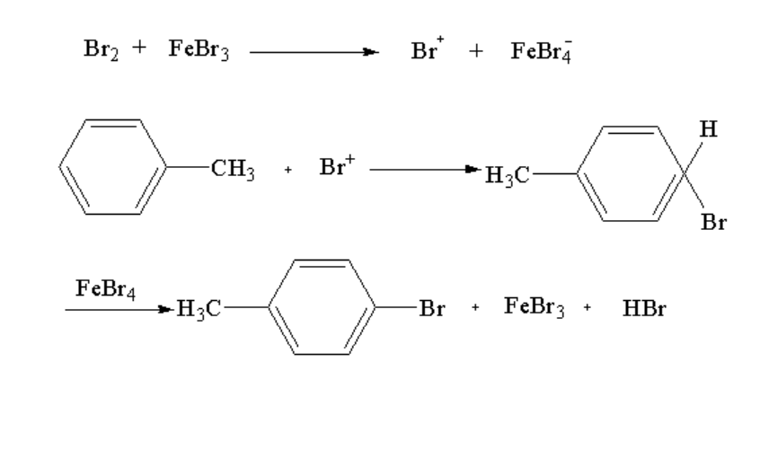 Note: In the electrophilic substitution reaction of toluene and iron (III) oxide, iron (III) bromide acts as a lewis acid. Lewis acids are the species that accept lone pairs of electrons.