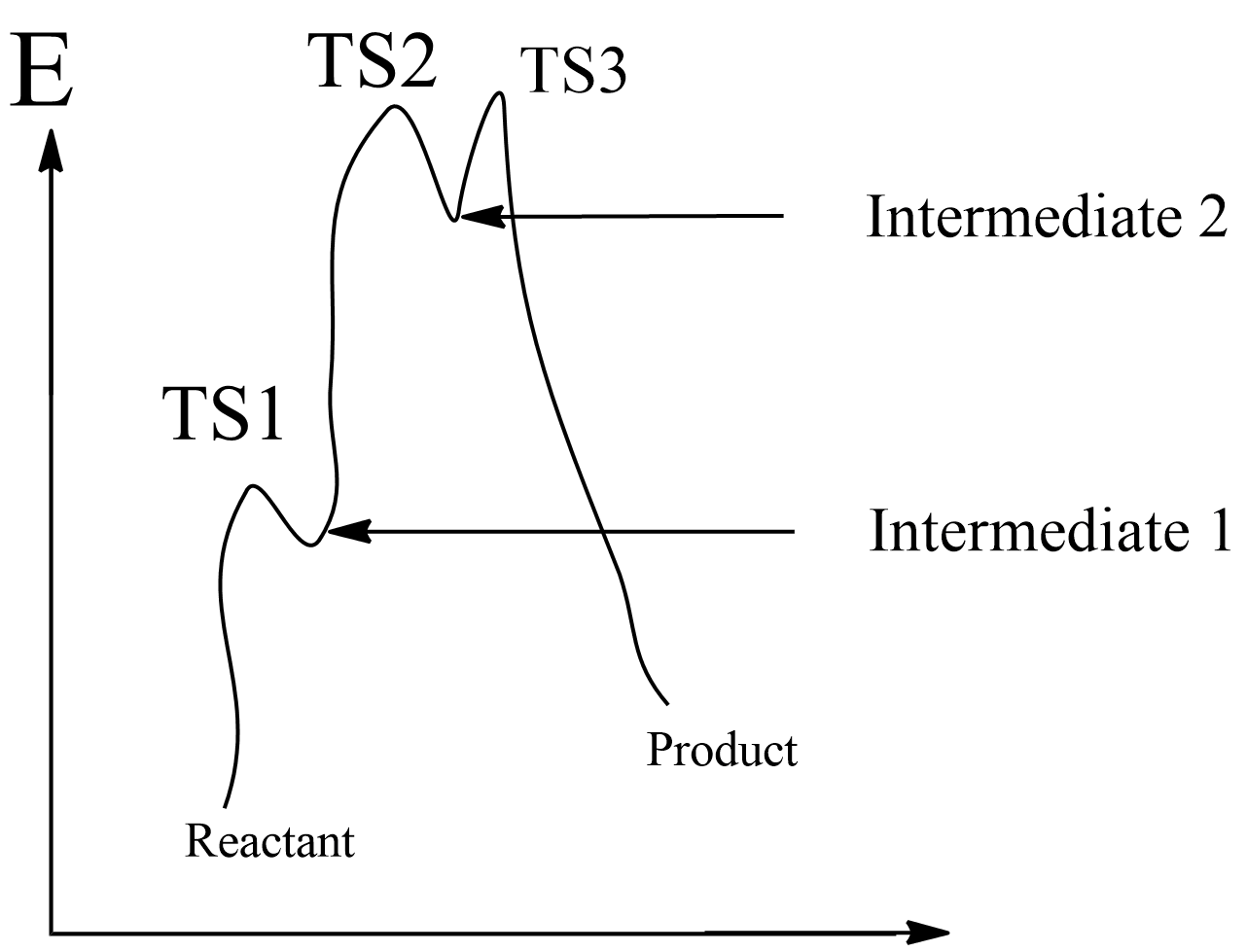 In the given reaction with three transition states TS1, TS2, and TS3, which exist with two intermediates as intermediate 1 and intermediate 2 based on their energy level. Generally, the transition state tries to bring stability with less energy difference.