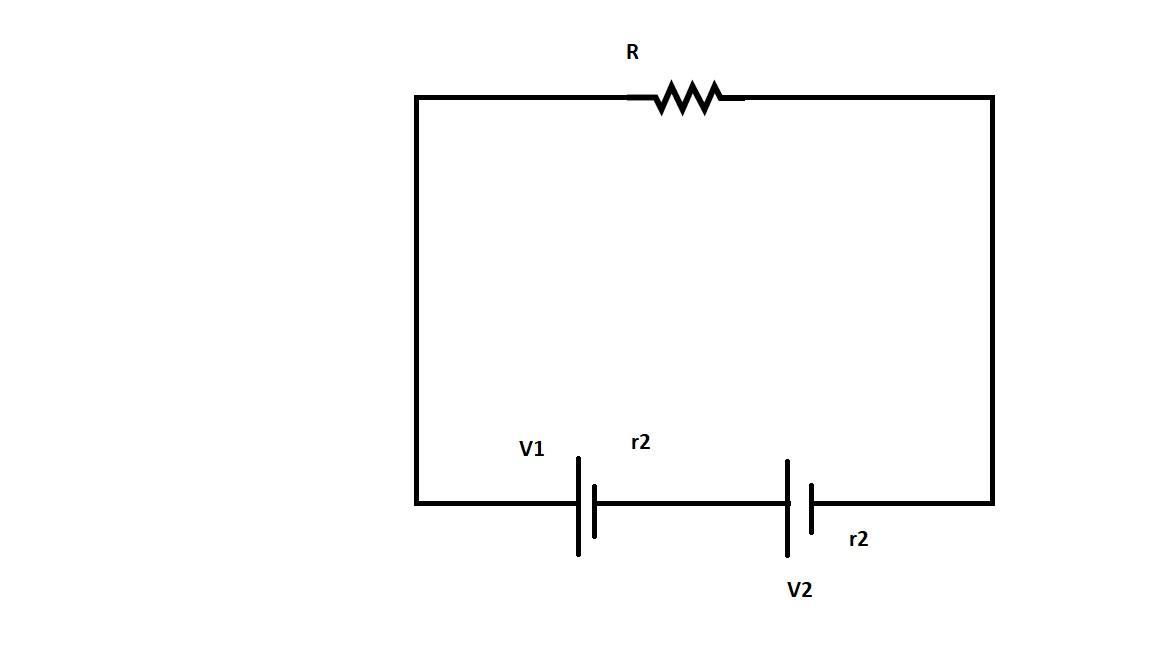 \[{V_1}\] is the $emf$ of the first battery and \[{V_2}\] is that of the second one. \[{r_1}\] is the internal resistance of the first battery and \[{r_2}\] is that of the second. \[R\] in the load resistance.