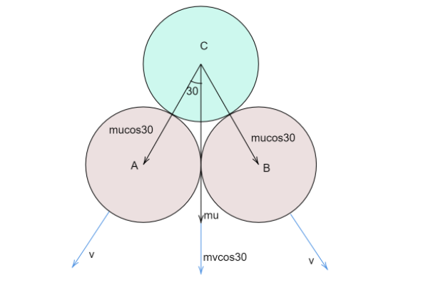 The ball C approaches the other balls at an angle of $30^\circ $from the vertical.