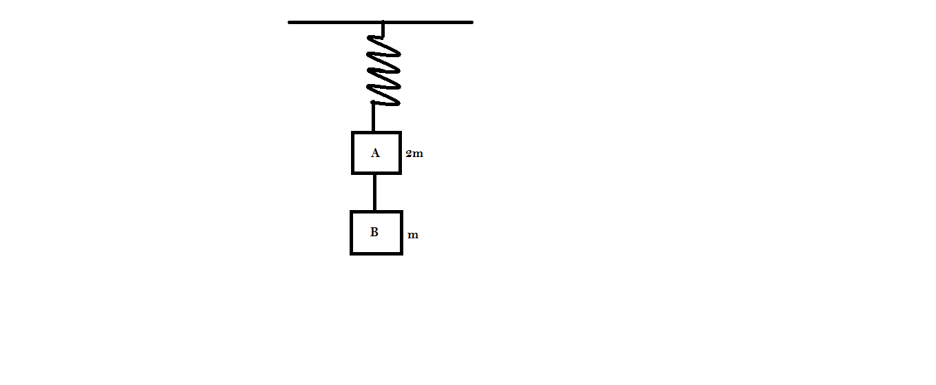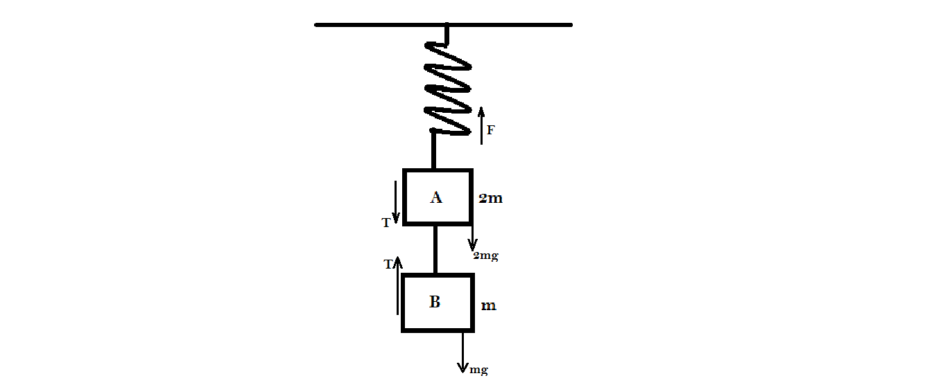Step 2: Since both the blocks are connected and are hanged by a spring. Therefore the total amount of force balanced out by the spring will be $mg + 2mg$ . If the force applied by the spring is $F$ to keep the system in equilibrium then