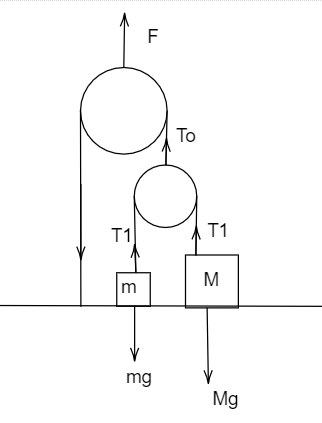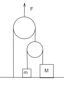 Two blocks of mass $m = 5Kg$ and $M = 10Kg$ are connected by a string passing over a pulley B as shown. Another string connects the center of pulley B to the floor and passes over another pulley A as shown. An upward force F is applied at the center of pulley A. Both the pulleys are massless. An upward force F is applied in the pulley A. Find the acceleration of blocks m and M if F is $100N$.