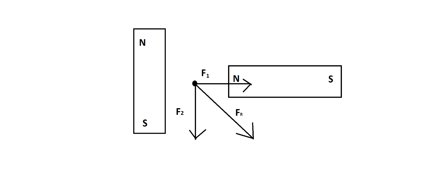 Now here we draw an image of the line of force at point P due to bar magnets. Here we see that the magnetic line of force ${F_1}$ is horizontal and ${F_2}$ is in vertical direction. Now if we find the resultant of these two vectors, we get ${F_R}$ . Now if we compare the option with them then we $ \searrow $ is the approximately matching with ${F_R}$ .