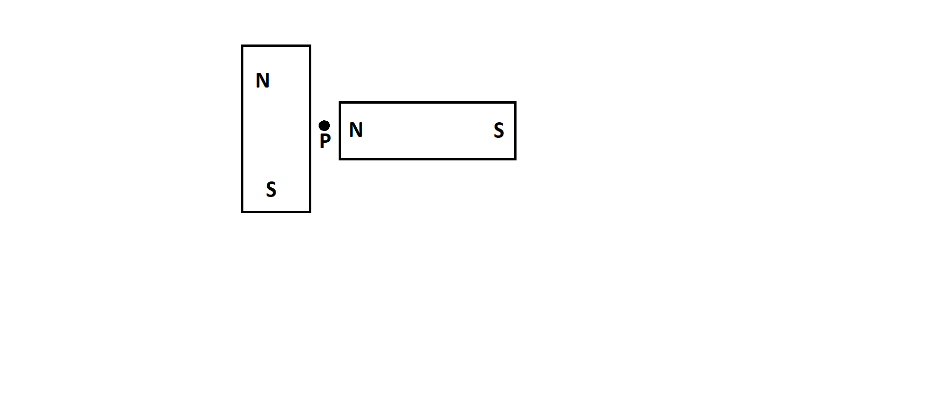 Two equal bar magnets are kept as shown in the figure. The direction of resultant magnetic field, indicated by arrow head at the point P is (approximately)