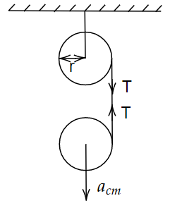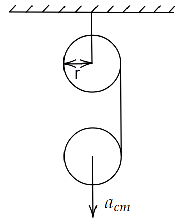 Hint:Before we start addressing the problem, we need to know about what data has been provided and what we need to solve. Here they have given the mass of two identical discs as m and r , the angular acceleration of the lower disc is \[\alpha \] and the acceleration of the center of mass of the lower disc is \[{a_{cm}}\], then we need to find the relation among \[{a_{cm}}\], \[\alpha \] and r.