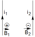 Now using the Fleming’s left hand thumb rule such that point your thumb in the direction of current and the curl of fingers will give the direction of magnetic field so, when two wires having current ${{i}_{1}}\,\And {{i}_{2}}$ in same direction then magnetic fields ${{B}_{1}}\,\And \,\,{{B}_{2}}$ due to both wires will be opposite in direction between them one is anticlockwise and other is clockwise and thus behaving like two opposite poles of a magnet.