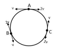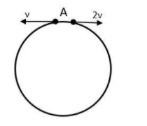 Let us assume that the radius of the circular orbit be R and at time t = 0, the two particles start to move in opposite directions with velocity v and 2v.