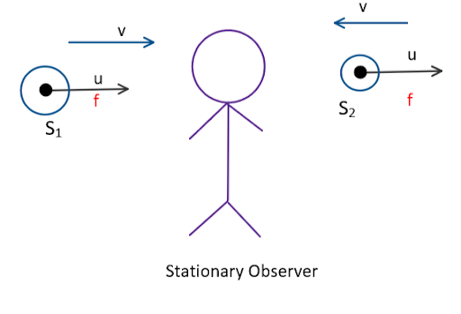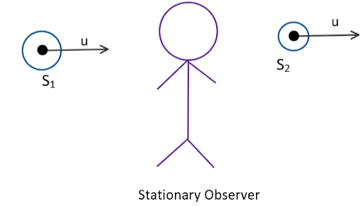Two Sources ${S_1}$ and ${S_2}$ of the same frequency $f$ emit sound (given) and these sources are moving in the same direction as shown in figure 2. The velocity of the two sources is again same i.e., $u$(given). And, velocity of sound $v = 0$ (given). As the observer is stationary, therefore, the direction of sound waves must be opposite in direction as shown in figure 2.