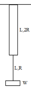 It is given in the problem that the two wires of the same material (young’s modulus Y) and same length L but radii R and 2R respectively are joined end to end and a weight W is suspended from the combination and we need to find the elastic potential energy in the system in equilibrium condition.