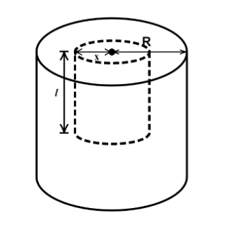 Here, the long cylinder with radius $R$ is shown in a solid line and the Gaussian surface that we have taken with radius $x$and length $l$is shown in the dotted line.