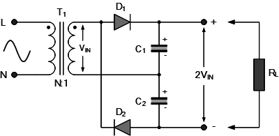 A rectifier circuit's DC output voltage (Vdc) is typically constrained by the sinusoidal input voltage's peak value. However, by combining rectifier diodes and capacitors, we may double this input peak voltage to produce a DC output that is an odd or even multiple of the AC input voltage peak voltage. A simple voltage multiplier circuit is shown below.