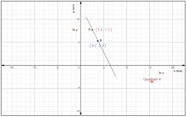 Variables x and y are such that, when $\ln y$ is plotted on the vertical axis and $\ln x$ is plotted on the horizontal axis, a straight line graph passing through the points $\left( {2.5,7.7} \right)$ and \[\left( {3.7,5.3} \right)\] is obtained.