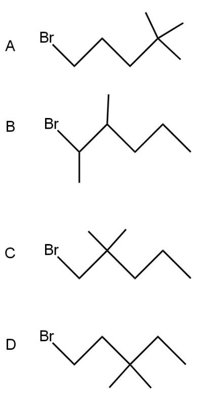 Hint: In the given options, bromine is bonded which is a good leaving group. Thus, it leaves compounds easily and generates carbonation. This carbonation will get attacked by nucleophiles. And the rate of this nucleophile attack will be greater at the carbonation which is surrounded with less bulky groups (less steric hindrance).