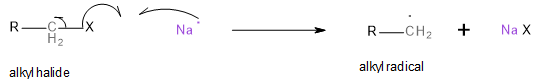 The alkali metal used in the Wurtz reaction is sodium (\[Na\]). Shown below is the formation of an alkyl radical by sodium.