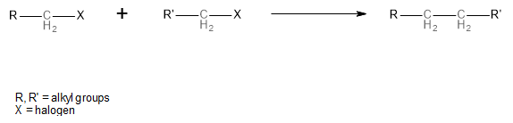 This reaction can occur with two different alkyl halide molecules and with two molecules of the same alkyl halide, in which case, the resulting alkane will have twice the number of carbon atoms. The general scheme of this reaction is shown below: