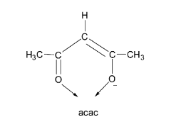 Let us first consider the acetylacetonate ion. It is denoted by the symbol ‘acac’. From its structure, it can be seen that acac contains two oxygen donor atoms and carries only a single negative charge. Thus, it is a bidentate monoanionic ligand.