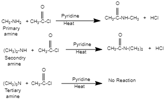Note: The hydrogen attached to nitrogen is analysed and not with carbon as the hydrogen attached to nitrogen gets released in the form of $HCl$ , which shifts the equilibrium to the right hand side of the reaction. So, there should be at least one hydrogen attached to nitrogen in an amine to undergo acetylation.