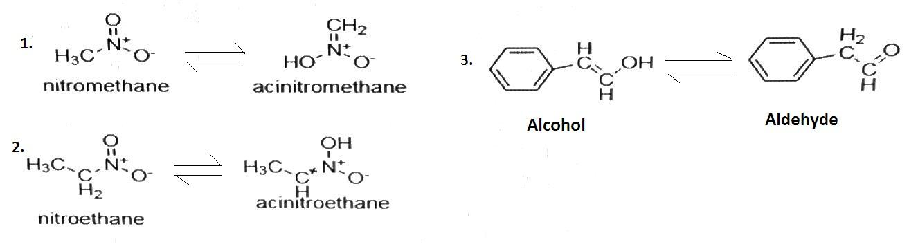 The tautomers of nitro-methane, nitro-ethane and${{\text{C}}_6}{{\text{H}}_5}{\text{CH = CH - OH}}$ is given as-