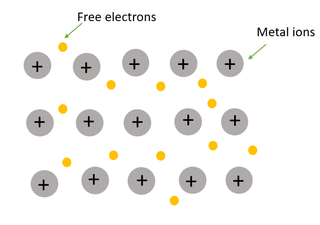 In metallic solid the mobile electrons are not held between a couple of atoms i.e., they can delocalize. On the other hand, the metallic solid possesses a sea of electrons everywhere (Image 1).