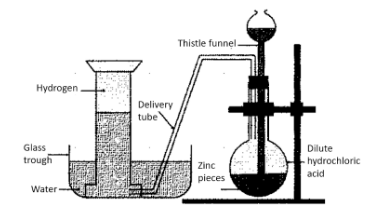 3. The reaction between the acid and the zinc granules would release hydrogen gas. The gas thus produced is transferred to a vessel filled with water, via a delivery tube.
