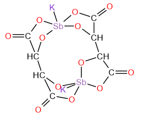 4. Antimony potassium tartrate/ tartar emetic with chemical formula K2Sb2(C4H2O6)2.
