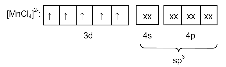 From the electronic arrangement, the hybridization is \[s{p^3}\]. Therefore, the geometry is tetrahedral. As a compound contain one unpaired electron so the magnetic nature of \[{\left[ {MnC{l_4}} \right]^{2 - }}\] is paramagnetic.