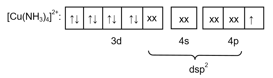 From the electronic arrangement, the hybridization is \[ds{p^2}\]. Therefore, the geometry is square planar. As a compound contains one unpaired electron so the magnetic nature of \[{\left[ {Cu{{\left( {N{H_3}} \right)}_4}} \right]^{2 + }}\] is paramagnetic.