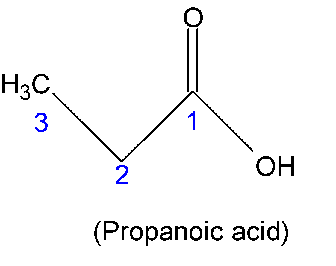 $C{{H}_{3}}C{{H}_{2}}COOH$ has three carbon atoms and thereby the IUPAC name of this compound is propanoic acid.