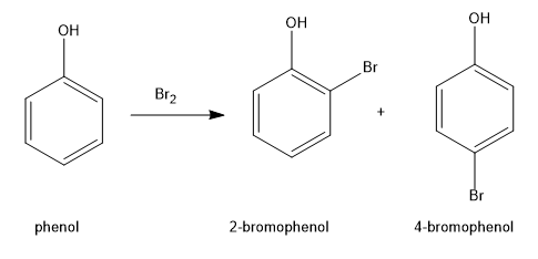 An aromatic compound undergoes bromination through electrophilic substitution mechanism. Phenol reacts with bromine \[{\rm{(B}}{{\rm{r}}_{\rm{2}}}{\rm{)}}\] to form the products as \[{\rm{2 - bromophenol}}\] and \[{\rm{4 - bromophenol}}\]. \[{\rm{4 - bromophenol}}\]is the major product due to less steric hindrance.