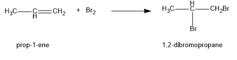 Alkene is known to undergo bromination reaction through an addition reaction. Propene reacts with bromine \[{\rm{(B}}{{\rm{r}}_{\rm{2}}}{\rm{)}}\] to form the product as \[{\rm{1,2 - dibromopropane}}\]. Bromination in unsaturated compounds takes place via the formation of bromonium ion intermediate.