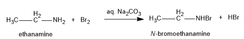 Ethylamine (or ethanamine) reacts with bromine \[{\rm{(B}}{{\rm{r}}_{\rm{2}}}{\rm{)}}\] in presence of aqueous sodium carbonate to form the products as N-bromoethanamine and hydrobromic acid.