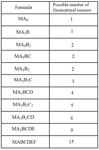 In the case of octahedral complexes having monodentate ligands, the geometrical isomerism can be summarised as follows: