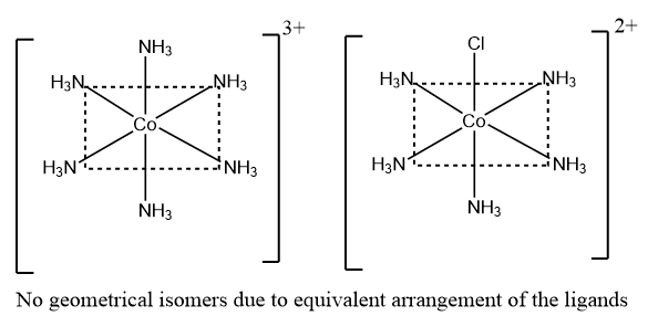 As summarised in the data, it is observed that the complexes of type ${{\left[ M{{A}_{6}} \right]}^{n\pm }}$ and ${{\left[ M{{A}_{5}}B \right]}^{n\pm }}$ does not show geometrical isomerism because all the corners of the regular octahedron are equivalent and no arrangement is observed. An example of such complexes is given below:
