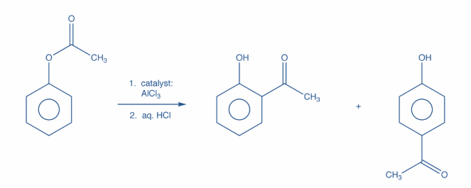 Moreover, this rearrangement is ortho and para selective i.e. the acyl group attaches itself at the ortho or para positions of the aryl ring. The reaction is as shown: