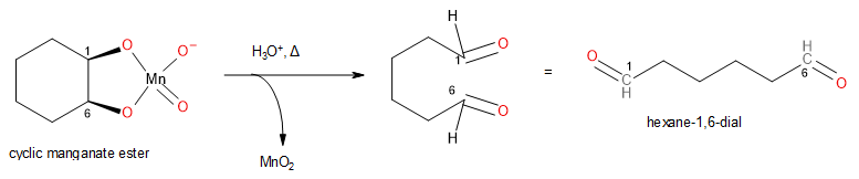 The cyclic manganate ester so formed is unstable and under hot conditions, in the presence of an acid, the single bond between C1 and C6 cleaves, and this results in the formation of hexane-1,6-dial as shown below: