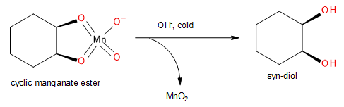 Note: It is very important to remember that the above-mentioned reaction occurs only under hot conditions in the presence of an acid. If the reaction is carried out under cold conditions in a basic medium, the cyclic manganate ester will convert into a syn-diol instead of an aldehyde. This reaction is called syn-dihydroxylation.