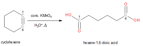 Thus, cyclohexene can be converted into hexane-1,6-dioic acid by heating with concentrated Potassium permanganate under acidic conditions.