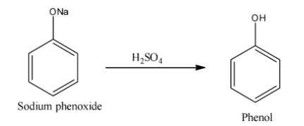 After formation of sodium phenoxide hydrolysis of sulphuric acid given phenol. Sodium phenoxide is an organic compound with molecular formula ${\rm{NaO}}{{\rm{C}}_{\rm{6}}}{{\rm{H}}_{\rm{5}}}$. For the formation of phenol from sodium phenoxide heat is not required. We write the reaction of formation of phenol is as follows: