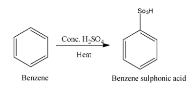 We know that benzene is an organic compound and molecular formula is ${{\rm{C}}_6}{{\rm{H}}_{\rm{6}}}$. Benzene reacts with concentrated sulphuric acid $\left({{\rm{conc}}{\rm{.}}{{\rm{H}}_{\rm{2}}}{\rm{S}}{{\rm{O}}_{\rm{4}}}} \right)$ in presence of heat and form benzene sulphonic acid. Benzene sulphonic acid is an organosulfur compound with formula ${{\rm{C}}_{\rm{6}}}{{\rm{H}}_{\rm{6}}}{{\rm{O}}_{\rm{3}}}{\rm{S}}$. Now, we write the reaction between benzene and conc. sulphuric acid in presence of heat is as follows: