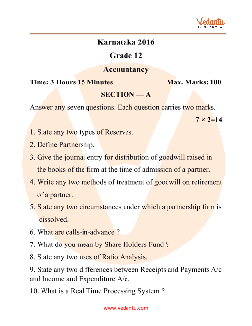 Class 12 Accountancy KSEEB Question Paper 2016 - Free PDF Download