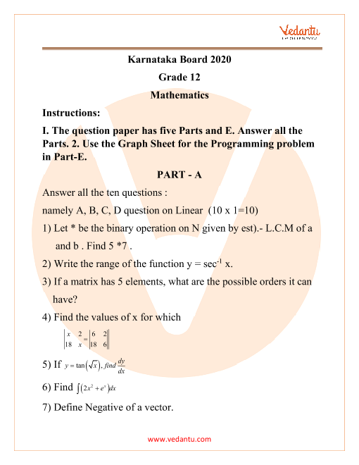 Class 12 Maths KSEEB Question Paper 2020 - Free PDF Download